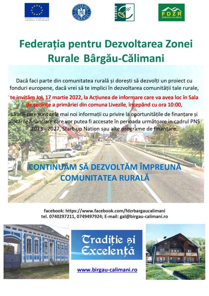 Joi 31 august 2017, începând cu ora 14:00 vă așteptăm la Centrul Multifuncțional din localitatea Prundu Bîrgăului, pentru a vă informa despre modalitățile de accesare a fondurilor europene și deschiderea primei sesiuni de depunere proiecte la GAL FDZR Bârgău-Călimani. Seminarul informativ face parte din seria de evenimente pentru promovarea Strategiei de Dezvoltare Locală 2016 – 2023 a GAL Federația pentru Dezvoltarea Zonei Rurale Bârgău-Călimani. (mai mult…)