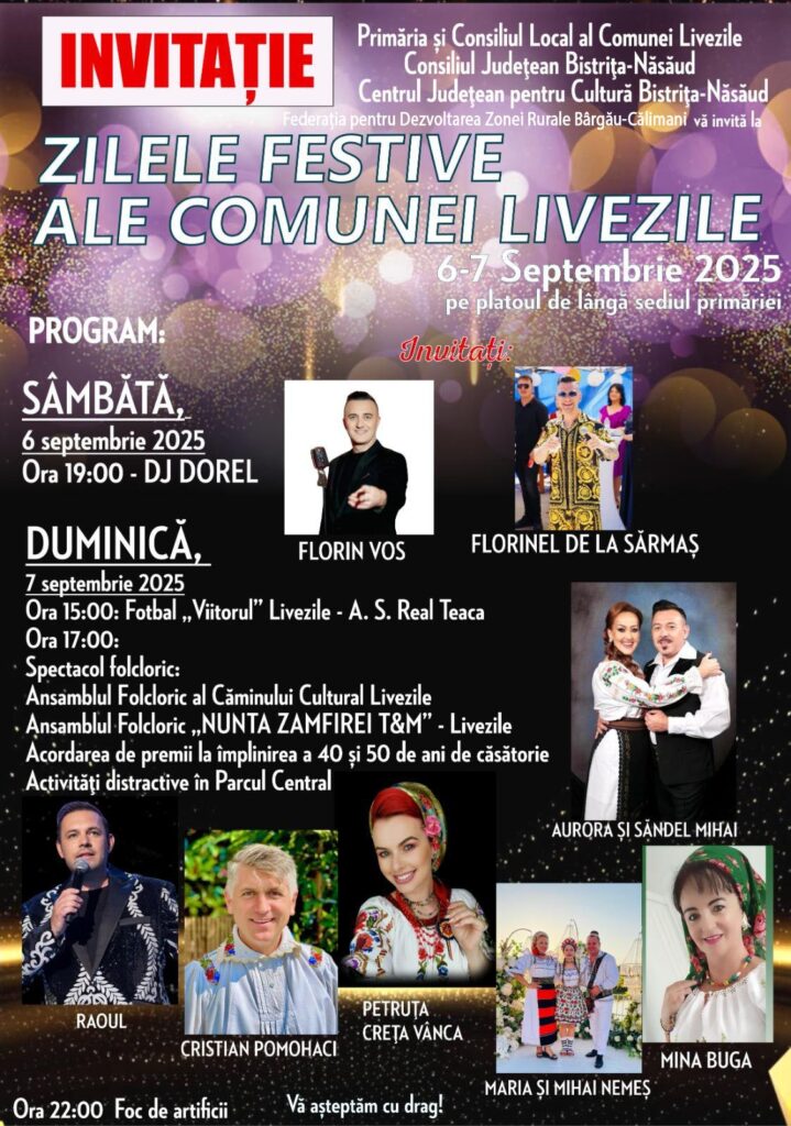 În perioada 6–7 septembrie 2025, comuna Livezile se îmbracă în straie de sărbătoare, găzduind tradiționalul eveniment Zilele Festive ale Comunei Livezile, organizat de Primăria și Consiliul Local Livezile, cu sprijinul Consiliului Județean Bistrița-Năsăud, Centrului Județean pentru Cultură și al Federației pentru Dezvoltarea Zonei Rurale Bârgău-Călimani.