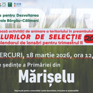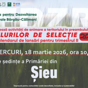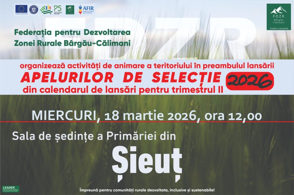 Vă invităm să participați Miercuri 18.03.2026 începând cu ora 12:00 în Localitatea Șieuț, comuna Șieuț în sala de sedințe a primăriei, la întâlnirea de animare organizată în preambulul lansării apelurilor de selecție din cadrul proiectului: „Sprijin pentru gestionarea, monitorizarea și evaluarea Strategiei de Dezvoltare Locală, precum și animarea acesteia – componenta DR 36-F”.