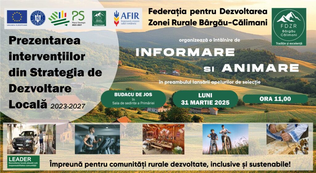 Grupul de Acţiune Locală Federaţia pentru Dezvoltarea Zonei Rurale „Bârgău – Călimani” vă invită luni, 31 martie 2025, începand cu ora 11:00, în Comuna Budacu de Jos, în sala de ședințe a primăriei, la ultima întâlnire de informare și animare din preambulul lansării apelurilor de selecție, din acest trimestru.