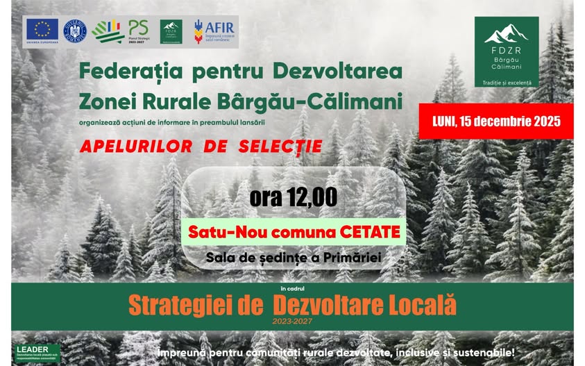 Vă invităm cu drag să participați Luni 15.12.2025, începând cu ora 12:00 în LocalitateaSatu-Nou, comuna Cetate in sala de sedinte a primarei, la o nouă întâlnire de animare organizată în preambulul lansării apelurilor de selecție din cadrul proiectului: „Sprijin pentru gestionarea, monitorizarea și evaluarea Strategiei de Dezvoltare Locală, precum și animarea acesteia – componenta DR 36-F”.