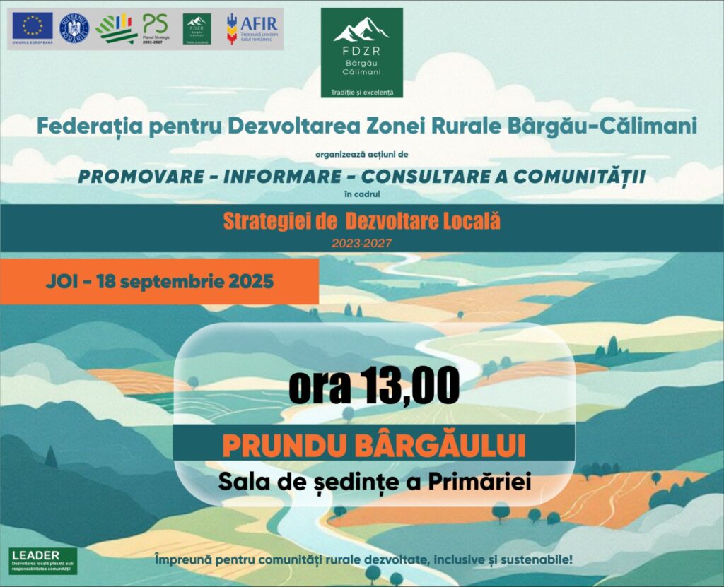 Vă așteptăm la o nouă întâlnire dedicată informării și consultării comunității locale, dar și a tuturor celor interesați de dezvoltarea zonei rurale care va avea loc Joi, 18.09.2025 în Localitatea Prundu Bârgăului, comuna Prundu Bârgăului în sala de ședințe a primăriei, începând cu ora 13:00.