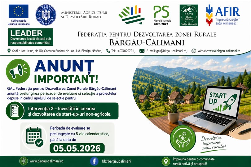 GAL „Federația pentru Dezvoltarea Zonei Rurale Bârgău-Călimani” lansează sesiunea de depunere a proiectelor pentru Intervenția 4 – Servicii sociale pentru comunitățile rurale, cu finanțare nerambursabilă 100% și sume cuprinse între 5.000–60.000 euro/proiect. Apelul de selecție este deschis timp de 30 de zile începând cu data de 31.03.2026, iar depunerea se face exclusiv online, conform Ghidului Solicitantului. Fondurile disponibile sunt de 241.000 euro, iar pragul minim de selecție este 70 de puncte.